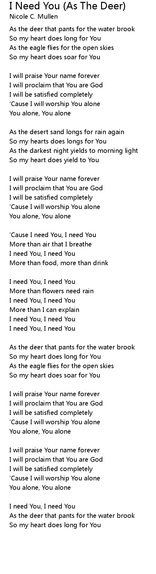 As the Deer Pants for the Water with lyrics for congregations, "As the Deer Pants for the Water " was written by Marty Nystrom, published in 1984. The opening line is taken from psalm 42. . We Have got 15 images about As The Deer Pants For The Water Lyrics images, photos, pictures, backgrounds, and more. In such page, we additionally have number of images out there. Such as png, jpg, animated gifs, pic art, symbol, blackandwhite, pix, etc. "Don Moen - As The Deer with lyrics", "My soul faints with longing for your salvation, but I have put my hope in your word." Psalm 119:81.. "As the Deer (worship video w\/ lyrics)", Simple worship video we use at church I do not own the songs or the lyrics ! If you download you must own your own legal copy of ..